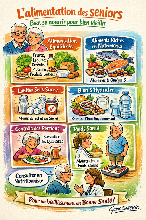 En résumé, une alimentation équilibrée, riche en nutriments, associée à une hydratation adéquate et à une attention particulière à la quantité de sel et de sucre, peut aider les seniors à maintenir leur santé et à bien vieillir. Il est également important de consulter régulièrement un professionnel de la santé pour obtenir des conseils personnalisés en matière de nutrition.